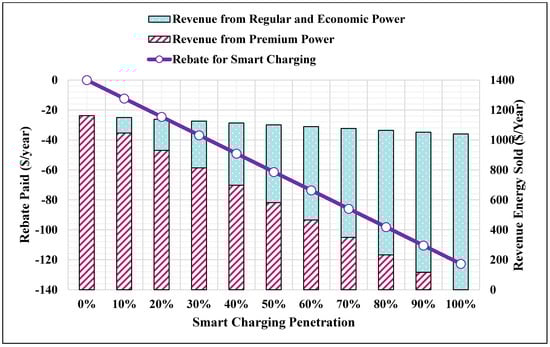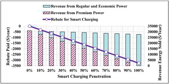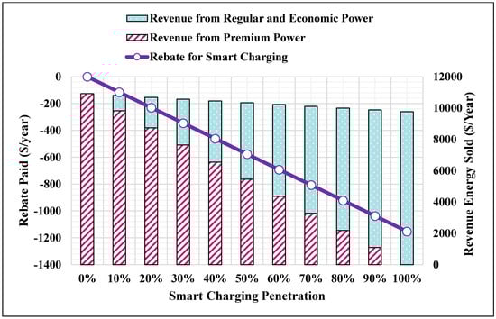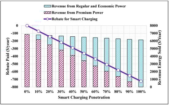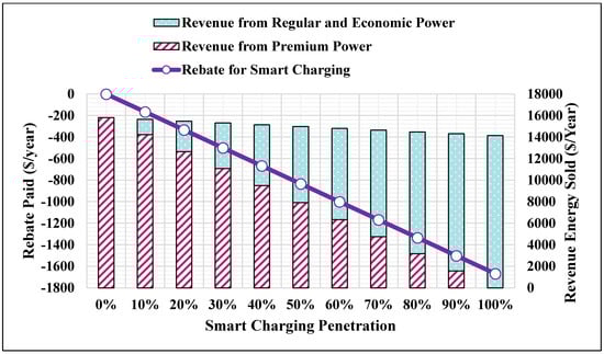 where is a uniform random number, is the share of PBEV that utilizes smart charging power at the FCS, , , and are the 25th, 50th, and 75th percentile annual rebates paid to the customer for using smart charging power (), and and are the maximum and minimum annual rebates paid to customers for using smart charging power (). If in Equations (55)–(59), then . It means that all customers utilize the premium charging power because the share of customers using regular and economic charging powers () is zero. Therefore, the (maximum, minimum, 25th percentile, 50th percentile, 75th percentile) annual rebates in Equations (55)–(59) are zero. In that case, the FCS operator would not pay any rebate to customers and the annual cost is represented only by revenue from selling the energy to customers who use the premium charging power. If, in Equations (50)–(54), and/or , then . It means that regular and/or economic charging power have been utilized in that year. The share of customers utilizing these two charging powers (regular and economic) is determined by the factor . Multiple smart charging penetration levels () are considered in this regard. The penetration level is varied from 0% up to 100% by 10%. The factor , in Equations (55)–(59), is utilized to determine the percent of customers who used regular charging power and the percent of customers who used economic charging power. The factor is randomly generated using a uniform random number and repeated multiple times. In Equation (50), for instance, when , it means that the share of vehicles that use the regular charging power is ; thus, the economic charging power has not been utilized. In contrast, when , it means that share of vehicles that use the economic charging power is ; thus, the regular charging power has not been utilized. When , it means that 50% of uses the regular charging power while the economic charging power is utilized by the other 50% of . Therefore, is a shaping factor utilized to assign, based on the penetration level of , the percent of vehicles that use the regular charging power and the percent of vehicles that use the economic charging power. Equations (55)–(59) can be written in a long form as follows: