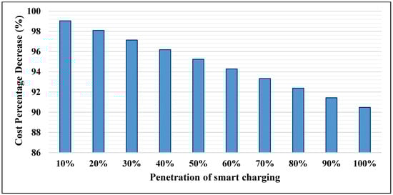 The maximum cost of charge () is estimated for any vehicle as in Equation (29). The difference between the maximum and minimum state-of-charge () and () is multiplied by the battery capacity as in (29) to find the required energy in kwh. The cost of the required energy is calculated according to the per unit cost of the utilized charging power ().