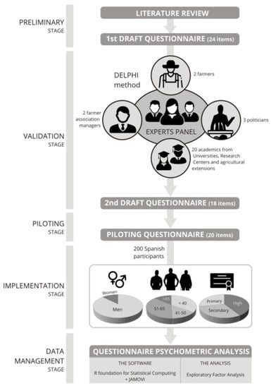 A panel of experts (Delphi) was set up in order to obtain qualitative information essential for the detection of barriers such as lack of information and training, detachment between wellbeing and ecosystem services, insufficient financing, social rejection towards the environmental movement, economic obstacles, and policy obstacles. This panel consisted of 27 experts with different expertise and skills in the olive oil sector and included 2 farmers, 2 farmer associations managers, 3 politicians, 20 academics from Universities, Research Centres and agricultural extensions, and people without higher education degrees to check for clarity and ease of understanding, of Spain, Portugal, Italy, Greece, Tunisia and Morocco, which altogether account for 77.6% of the olive oil production worldwide [27]. The initial questionnaire had 24 items. This pool of items was administered to the expert panel for their consideration. Each item was scored based on its relevance and understanding (clarity). Items that were similar to other items, not relevant, ambiguous or rarely endorsed were excluded from the items pool. When items used different words to refer to the same barrier, just one item was selected, or the items were rephrased into a single new item. In addition, the expert panel then added items not yet covered that were known to be important for the implementation of combination of sustainable management practices. Open boxes were available to facilitate the inclusion of new items raised by experts. Those items that have been marked as relevant and were sufficiently clear by at least 70% of the experts were kept. We kept the wording of the item as long as it was classified as clear by at least 70% of the experts. The experts’ feedback was used to delete, add and rephrase items to create the questionnaire for piloting.