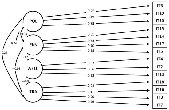 Once the number of factors recommended based on the EFA analysis, the CFA analysis was performed, using four factors: (1) the lack of information and training; (2) the lack of policy support; (3) the recognition of the wellbeing–nature connection; (4) the environmental awareness. The CFA was performed using R software [36].