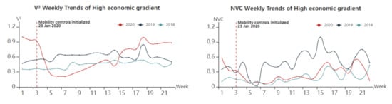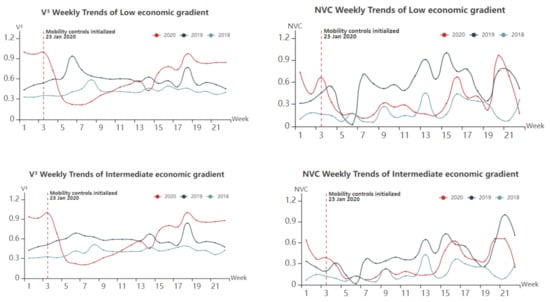 NVC and V3 weekly trends of regions with different economic gradients.