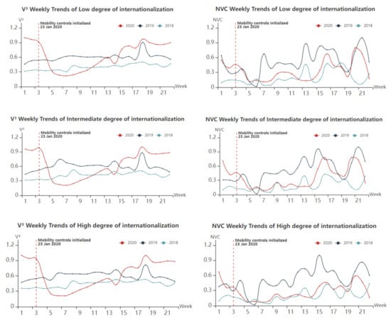 NVC and V3 weekly trends of regions with different degrees of internationalization.