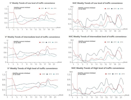 NVC and V3 weekly trends of regions with different levels of traffic convenience.