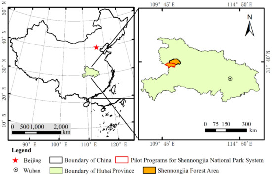 PPSNPS was established in 2016. It is one of five national park system pilots in China [24]. PPSNPS is located in the southwest of the Shennongjia Forest District in Hubei Province. Its geographical coordinates are 109°56′ E–110°36′ E, 31°21′ N–31°36′ N. The east–west width is 63.9 km, the north–south length is 27.8 km, and the total area is 116,988 ha, accounting for 35.97% of the total area of the Shennongjia Forest District (Figure 1). PPSNPS is rich in flora and fauna; it is the habitat for many rare animals such as the Chinese newt, chuan golden monkey, clouded leopard, and the Asian black bear. There are 3684 species of vascular plants spanning 210 families and 1186 genera. Among them, ferns account for 27 families, 75 genera, and 309 species; seed plants can be demarcated into 183 families, 1111 genera, and 3375 species; and deciduous woody plants span 77 families, 245 genera, and 838 species. In addition, PPSNPS is the most abundant area of deciduous woody plants in the world and is also a veritable “green treasure house”, “species gene bank”, and “natural zoo” [25]. As early as 2009, Hubei Provincial Government vigorously implemented ecological compensation with respect to returning farmland to forest in PPSNPS. The basic awareness and functional system of local ecological compensation was formed. As a nature protected area, PPSNPS is under strict environmental protection, and this has concomitant impacts on the wellbeing and livelihoods of local residents. In 2017, PPSNPS began to develop tourism concession and implement an ecological compensation policy at the same time. As an enterprise for tourism concession, Shennong Tourism Investment Group Co., Ltd. (Hubei, China) (STIC) has the concession for tourism development in the PPSNPS. The Shennongjia National Park Administration (SNPA) is responsible for the management and protection of natural resources in PPSNPS and also supervises the operation of the company.