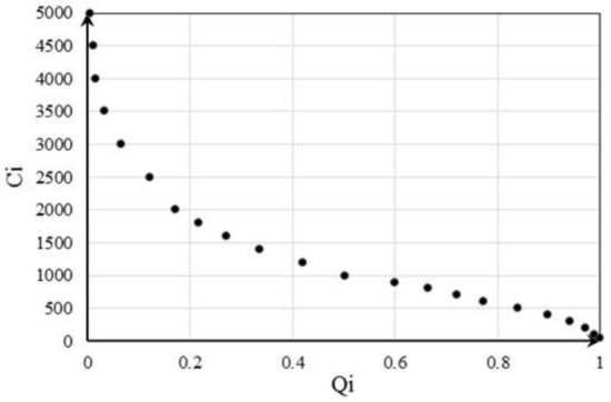 Through preprocessing, outliers in the data are removed, using linear regression to analysis the relationship of Ci and Qi, with Ci as the independent variable and Qi as the dependent variable. The results show that the coefficient of determination (R2) is 0.78, p < 0.001. Furthermore, a logarithmic regression model is established: lnQi = −0.0012Ci + 0.2639 (Equation (9)). The coefficient of determination (R2) of the logarithmic regression model is 0.99, p < 0.001 indicating that the model fits well.