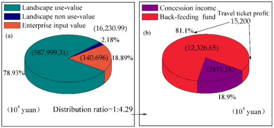 Based on the annual corporate financial report and official website data of the STIC, the input value of the STIC was 140,696 × 104 yuan in 2018. According to Equation (2), the landscape use value and non-use value of the PPSNPS are summed, and the landscape value is 604,230.3 × 104 yuan. Thus, the ratio of enterprise input value and landscape value is 1:4.29. According to statistics, the scenic spot of PPSNPS in 2018 realized a total of 29,500 × 104 yuan in tourist tickets and paid a total of 14,300 × 104 yuan in taxes, so the profit was therefore 15,200 × 104 yuan. In accordance with the investment ratio of STIC and SNPA, in 2018, STIC can receive 2873.35 × 104 yuan and SNPA can receive 12,326.65 × 104 yuan. Then, the back-feeding funds in 2018 should total 12,326.65 × 104 yuan (Figure 3).