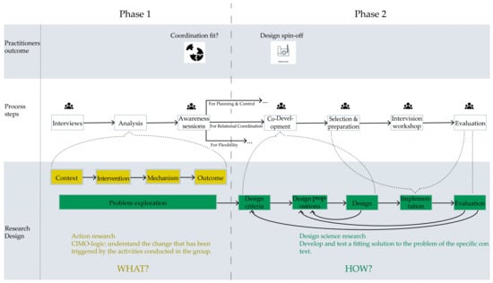 As mentioned in the literature review, the context of inter-organizational projects can be described as fuzzy, which means it is characterized by ill-defined requirements, complex interactions, design flexibility, and dependence on social and cognitive abilities [53]. Moreover, the collaboration between two or more organizations makes for authentic problem contexts which require in-depth, complex negotiations, which set significant boundaries on the feasibility of potential solutions [54]. As such, the effectiveness of building shared knowledge for relational coordination depends heavily on the ability to analyze and decipher complex inter-organizational contexts and develop solutions that are compatible with these socio-political contexts. DSR as a methodology is driven by problems encountered in a practical setting, and focuses on studying solutions which improve these [55]. Therefore, DSR can be used to create artifacts which solve decision making problems in complex inter-organizational settings. Despite the recognition of the benefits of incorporating DSR in the field of organizational and management studies [52,55,56], it has only been applied in a few cases. One reason for this is that DSR is often approached from a positivist worldview and creates prescriptive knowledge [57,58], which is uncommon for organizational sciences which focus on understanding general patterns.