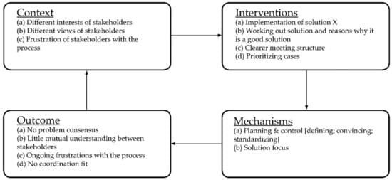 Van Aken and Romme [55] propose to generalize the understanding of DSR by making use of design propositions to address problems in the field. Design propositions can be regarded as “a chunk of general knowledge, linking an intervention or artifact with an expected outcome or performance in a certain field of application” [62] (p. 228), thus constituting generalizable solutions to types of problems. Denyer, Tranfield and van Aken [58] link design propositions using CIMO logic, which analyzes the action cycle, employing four phases consisting of Context, Intervention, Mechanism, and Outcome. This not only aids in clarifying fuzzy problem contexts but also aids in communicating the sequence of steps carried out during the research process [63]. Because the generalization of design propositions depends on a thorough understanding of the problem context, CIMO logic is used to analyze the inter-organizational problem context of the case study (see Section 3.3).