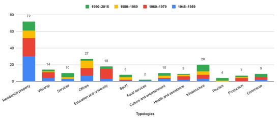 As far as types of use are concerned, the most common type of architecture surveyed in Genoa was residential (about 34%), followed by offices, infrastructure, education, and churches or places of worship (more than 10), demonstrating the great importance of housing in the second half of the 20th century, even to the detriment of the city’s liveability (Figure 1).