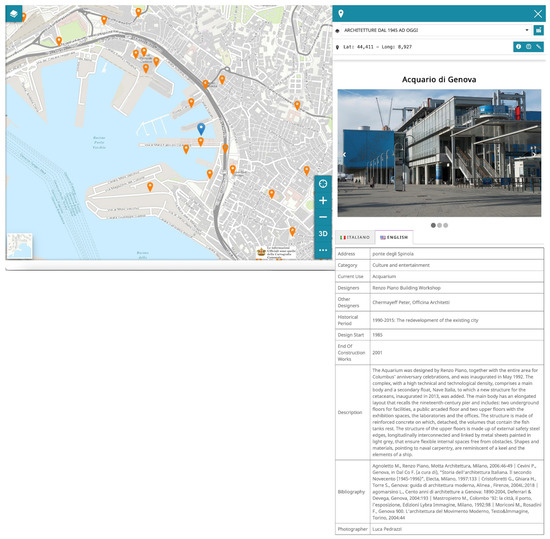 The implementation of the Geoportal of the Municipality of Genoa, with a section called “Contemporary Architecture from 1945 onwards in Genoa”, through the publication of an Open Data dataset, was intended to enhance these architectural works in relation to other data already present in the portal for a more complete reading of the city. Moreover, the Geoportal offers, through geostories, in-depth information on selected buildings, which can be sorted based on thematic itineraries or by author.