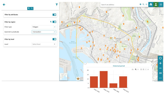 The enquiry form (Figure 3), available in two languages (Italian and English), allows visualising, for the selected building, one or more photographs in carousel mode, in addition to the data listed above, and is a tool with great popular and tourist value. The Geoportal allows users to create graphs, tables, and counters to analyse the information more effectively through a spatial query (Figure 4).