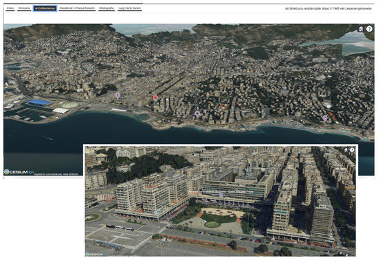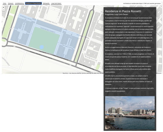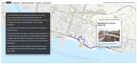 A review of the websites of the Italian regional county seats showed that all of them were equipped with a geoportal for map consultation, while only two, apart from Genoa, had developed interactive multimedia contents through geostories. In particular, the cities of Milan and Cagliari developed Storymaps based on Esri’s proprietary technology, achieving the objective of making topics of architectural or touristic interest more accessible [21,22].