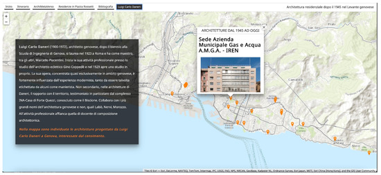 View of the third section of the geostory regarding the first building: the map shows the buildings designed by Luigi Carlo Daneri, and a short biography of the architect is included in the box.