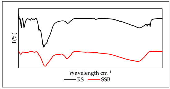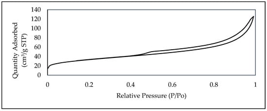 Table 2 presents the BET results of SSB. The specific surface area (BET) of the SSB was found to be 117.67 m2/g, and the total BJH volume was 0.007 cm3/g. According to the adsorption–desorption isotherm (shown in Figure 1), SSB has a reversible convex curve and matches, approximately, with type III, according to IUPAC classification [34]. This type indicates that the adsorbent has a microporous structure and contains many mesopores [35].
