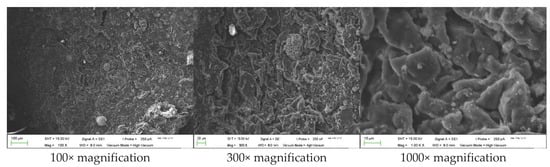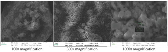 The N2 adsorption–desorption isotherms of SSB displayed a type IV curve (Figure 1). The absence of the H3-type hysteresis loop isotherm is due to the irregular structure of SSB, as illustrated with SEM [38]. Figure 2 and Figure 3 show the SEM images of the raw material and SSB at different magnifications. The sewage-sludge surface is heterogeneous and non-porous (Figure 2). Some pores have been formed on the SSB surface (Figure 3). The pore formation could be attributed to the carbonization process, which promoted the porous structure of the adsorbent [39]. The pores are formed during the removal of ash and volatile matter.