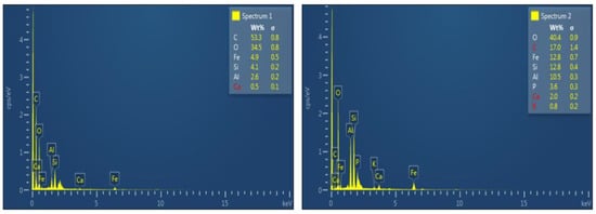 The sewage sludge EDX analysis (Figure 4) shows six elements in the composition of the raw sewage sludge (spectrum 1). Spectrum 1 shows a carbon signal at 0.277 KeV (53.3%) and oxygen at 34.5%, which gave a signal at 0.525 KeV. The spectrum, also, illustrates the existence of calcium (0.5%), Aluminum (2.6%), SI (4.1 %), and Fe (4.9%) at a low percentage, not exceeding 5% at K-alpha 3.690 KeV, 2.6 KeV, 2.7 KeV, and 6.12 KeV, respectively. The EDX analysis for SSB (Figure 4) showed eight elements in its composition (spectrum 2). Spectrum 2 shows a carbon signal at 0.26 KeV (17%), while oxygen is 40.4%, which appears at 5.25 KeV. Spectrum 2 also shows the existence of calcium (17%), Fe (12.8%), Si (12.8%), Al (10.5%), P (3.6%), and K (0.8%). Table 3 shows the elemental compositions of the raw sewage sludge and SSB in weightage percentage. The carbonization process decreased the carbon content of SSB, while the other elements’ percentages increased. Generally, the carbonization process expels the volatile matter. Chemical activation agents strip away the oxygen and enhance the decomposing process, leading to a rich carbon adsorbent [48]. It was shown that the C content of biochar activated by KOH could be either higher or lower than the original material, depending on the pyrolysis temperature and ash content of the raw material [49].