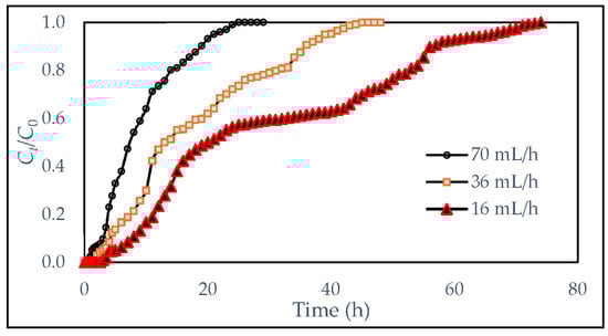Figure 6 depicts the change of the breakthrough curves, in a column packed with 12 cm of adsorbent and operated at flow rates of 16 mL/h, 36 mL/h, and 70 mL/h. It is evident that the breakthrough curve, at a lower flow rate (16 mL/h), tends to be more gradual and take longer to reach the point of exhaustion. However, at a higher flow rate, the curve becomes steeper. A similar trend was observed in the literature, during the adsorption of textile-industry effluent, using agro-waste-based activated carbon [58], removal of color from palm-oil-effluent wastewater using a sludge-based activated carbon [24], Chromium adsorption using crosslinked chitosan-Fe (III) complex (Ch-Fe) [59], and removal of Tartrazine anionic dye [60]. This trend, caused by the change in flow rate, could be attributed to the insufficient contact time between the adsorbate and adsorbent at a higher flow rate and to the rapid loading of adsorbent sites [61].