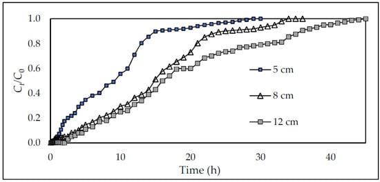 Figure 7 shows the breakthrough curves of different bed depths of 5 cm, 8 cm, and 12 cm, at a constant flow rate of 36 mL/h. It can be noticed that the breakthrough and exhausting times increase with the increase in bed depth. Decreasing the bed depth caused the breakthrough curves to become steeper and achieve faster saturation, resulting in the bed’s early exhaustion. It was reported that the removal of dyes increased with the increase in bed depth at a constant flow rate and initial concentration, due to the abundance of active sites at a more extended bed depth [62]. An increase in breakthrough time of RO84 dye adsorption, due to the increase in bed depth, was, also, reported by Samir Charola et al. [63]. Furthermore, the mass transfer zone developed in small bed depth is tiny, leading to a steeper breakthrough curve [64].