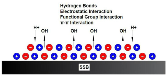 Adsorption of dyes onto the surface of biochar is carried out through multiple mechanisms, including electrostatic interactions, ion exchange, and π–π interactions. However, reactive dyes are removed through Van der Waals forces [68]. On the other hand, the biochar surface hosted many hydroxyl groups, which react with the reactive dyes to form hydrogen bonds. Hydroxyl groups (-OH) on the surface of biochar interact with the protonated amine (-NH3+) to form a hydrogen bond [69]. It is worth mentioning that batik-industry effluent consists of different types of reactive dyes, including naphthol, indigo soluble, and direct, remazol, and reactive dyes, which make it complicated to determine the adsorption mechanism [68]. Furthermore, the pH number affects the solubility of dyes and disassociation of functional groups. However, batik-wastewater effluent contains both cationic and anionic dyes, which are stable in an acidic medium (2–8). It was reported that a higher removal efficiency was achieved for anionic dyes in an acidic medium [68]. The possible mechanisms of adsorption into SSB are shown in Figure 8.