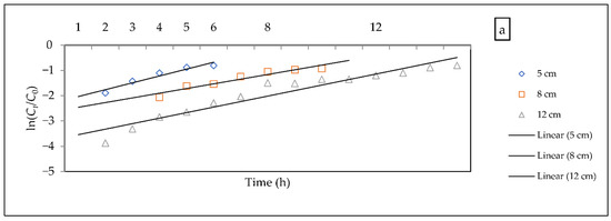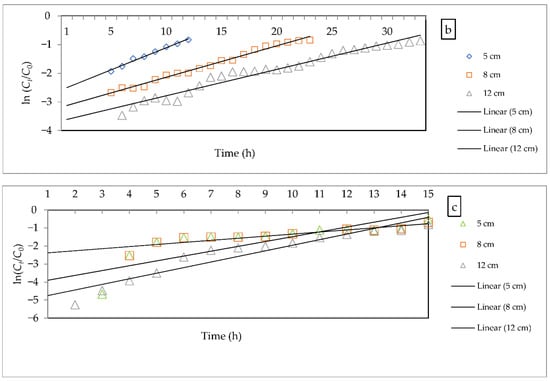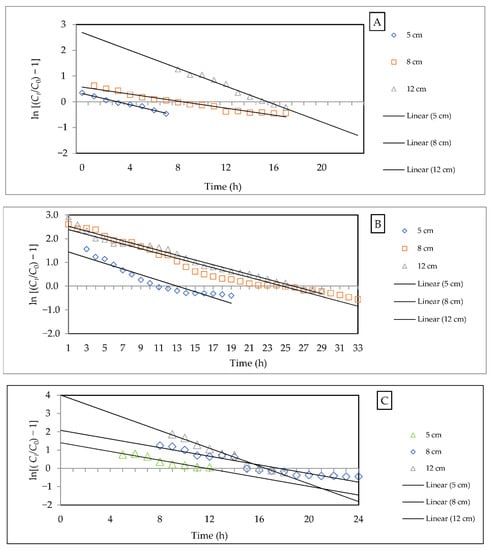 The Bohart–Adams model is, often, used to explain the initial part of the breakthrough curve (Ct/C0 < 0.5) [70]. In this model, the maximum adsorption capacity and Bohart–Adams kinetic constant () are determined, using a linear plot of ) against time (h), as shown in Figure 9. The parameters of this model were calculated with the aid of Equation (2), as illustrated in Table 6. However, this model provides a reliable breakthrough curve estimation, with a high correlation coefficient value of between 0.92 and 0.99. It is obvious that an increase in flow rate leads to an increase in value and . It indicates that the mass transfer zone controls the system of the adsorption process. This finding agrees with research conducted by Baral et al. [71]. The decrease in saturation concentration with the augmentation of bed depth could be assigned to the abundance of active sites [72,73]. The value was, also, reported to decrease with an increase in bed depth. This model provides a simple explanation of the breakthrough curve, restricted to the experiment conditions [64,74].