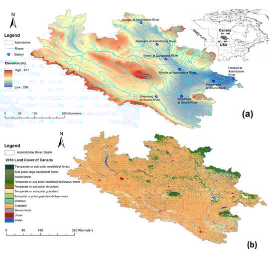 (a) Location, river network, hydrometric stations, and elevations of the Assiniboine River Basin (ARB); (b) land cover classification of the ARB.