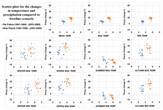 We examined the ARB ensemble of 15 initial–condition CanRCM4 (RCP 8.5) for the mean annual and seasonal differences in temperature and precipitation between the baseline period (1980–2010) and near (2021–2050) and far (2051–2080) future. Figure 2 shows scatter plots of the 15–member ensemble run for the mean annual and seasonal climate changes. The intra–model variability in mean annual precipitation ranges from 4 to 18% in the near future and from 12 to 28% in the far future. Thus, considerably more precipitation is expected in an average year although the possible range is relatively large. Seasonal precipitation shows that only summer precipitation is decreasing by ~2% in the near future and ~5% in the far future compared to the baseline scenario (1981–2010). There will be an increase in the mean annual temperature of around ~2–4 °C in the near future and ~4–5 °C in the far future. The largest increase is in the winter minimum temperatures compared to other seasons around ~3–4 °C in the near future and ~6–7 °C in the far future. The uncertainty of temperature and precipitation changes are much higher in winter, and spring compared to other seasons.
