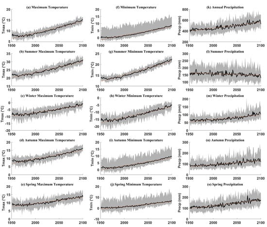 Time series (1951–2100) of annual and seasonal temperature and precipitation for the 15–member CanRCM4 ensemble (RCP 8.5). The maximum temperature (a–e) is in the first column, minimum temperature (f–j) is in the second column, and precipitation (k–o) is in the third column. The ensemble median (black) and linear trend (red) are shown.