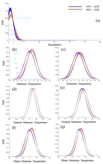 The PDFs of the daily precipitation (a) and minimum/maximum temperature (b,c) and for the summer (d,e) and winter (f,g) for contrasting 60–year baseline (1951–2010) and future (2041–2100) periods.