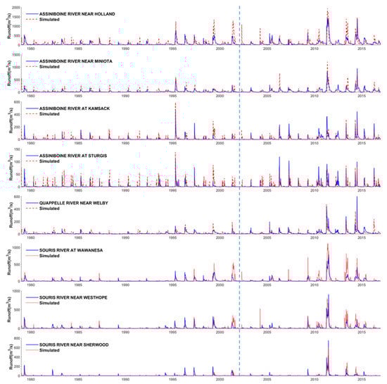 The MESH model was forced with bias–corrected WFDEI–GEM–CaPA with spatiotemporal resolution of 3 h × 10 km to calibrate the ARB MESH model at four naturalized hydrometric stations and validated at all eight hydrometric stations to capture the historical seasonal and snowmelt dynamics of all sub–basins and the entire catchment. Figure 5 shows observed and simulated daily flows in the ARB at the eight hydrometric stations. The results show that the simulated peak flows of naturalized flows are nearly underestimated and for other stations are overestimated. This catchment has experienced some extreme floods and droughts and heavy precipitation events. The ARB was mostly dry in the early 1980s and, therefore, we used a long calibration period (1979–2002) of 24 years to include some wet years. The validation period (2003–2016) of 14 years is a mixture of wet and dry years. The overall performance of model dynamics and the seasonal variability in river flows are well captured by the MESH model. The goodness of fit statistics in Table 4 indicates some good agreement between observed and modeled flow. The calibration Nash––Sutcliffe efficiency (NSE) ranges from 0.61 to 0.71, while the validation NSE ranges from 0.59 to 0.72. The calibration of low flow is important in ARB as the catchment has a sub–humid climate. We used the lnNSE method to assess the simulation of low flows. The performance is not as good as when compared to high flows. The results are always under an acceptable PBIAS range of 10%. The MESH model provides a close fit to the observed flows for the calibration, while for the independent validation period, the performance of the MESH model is somewhat reduced. The reduction is, however, limited and the model maintains a very good representation of the overall water balance and the inter–annual and seasonal dynamics.