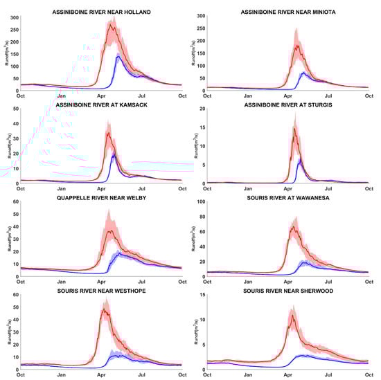 For discussion, we refer again to the previous studies on the hydrology of the ARB and the impact of climate change [6,7,8,9,10]. As mentioned above, all of these studies conducted hydrological modeling using the Soil and Water Assessment Tool. SWAT has been applied extensively throughout the world; however, it has limitations when applied to cold climates because SWAT simulates captures primarily temperature–driven snowmelt processes [24,25,26]. The MESH model we used, on the other hand, was developed by Canadian scientists specifically for cold–region watersheds. Among the previous studies of the ARB [8,10], the authors used SWAT model that they modified to account for the hydrology of prairie pothole wetlands, which fill and spill, resulting in a dynamic contributing area. There is no indication, however, in the previous studies of the ARB, that SWAT was modified to simulate runoff generated during rain on snow events and by snowmelt runoff over frozen ground.