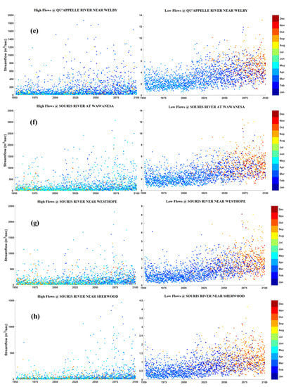 The changes in the magnitude and timing of extreme flows have great importance in the ARB. The risk of flooding in the ARB is much higher in the future periods with increasing precipitation in all seasons. Soil moisture at freeze–up is one of the major factors affecting spring runoff potential and spring flood risk. The runoff potential is significantly affected by the amount of additional snow and spring rains, frost depth at the time of runoff, and timing and rate of spring thaw, and the timing of peak flows in the ARB. Figure 7 illustrates the high and low flow changes per month (1951–2100) with the color coding of the months. The daily high flows are in the left column and low flows are in the right column at the eight hydrometric stations in Figure 7a–h. Spring high flows are significantly increased and tend to occur earlier in the year. There is a large increase in the range of low flows with a dramatic mid–21st century shift in timing from late winter to late summer and throughout the autumn. As winter becomes wetter and precipitation occurs more often as rain, winter is no longer the season of minimum flow, and rather the timing of low flows reflects the drier summers.