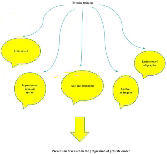 Over the past two decades, various studies have focused on the effectiveness of exercise as a therapeutic approach to cancer treatment. Clinical trials have shown that exercise therapy is an adjunctive tactic to improve quality of life and physical function and reduce the symptoms of cancer during treatment [38]. In addition to the role of aerobic exercise, eating habits also affect the growth and risk of cancer. Most epidemiological studies have shown that eating and aerobic exercise play an important role in the prevention of various cancers such as PCa [39]. Aerobic exercise can affect most of the pathways associated with PCa. Positive molecular mechanisms of exercise programs can be attributed to the reduction of inflammation due to low activation of nuclear factor-κB in cancer cells after exercise and growth suppression and increased apoptosis, p53, p21, and caspase activity leading to the inhibition of tumor growth indicated by tumor apoptosis and tumor suppression. Exercise can help with PCa treatment by reducing obesity and oxidative stress and modulating immune responses. Exercise reduces the level of blood circulation of testosterone and insulin-like growth factors [40].