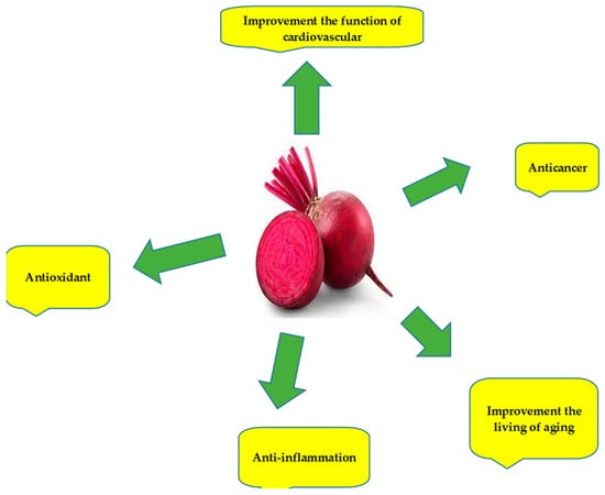 Beetroot is a plant with high nutrients and natural pigments. The use of beets comes from the roots themselves. Beetroot is mainly a volatile alcoholic compound due to its geosmin properties [66]. Red beets contain active compounds such as polyphenols, carotenoids, and vitamins that are useful for human health [67]. The compounds in beets have anti-cancer properties. Furthermore, beets are high in fiber, which is good for the health of the digestive system and cancer prevention [67]. The antioxidant properties of beets have led to their use in the treatment of diseases such as cardiovascular disease, anemia, impotence, and bladder stones [68]. Beets have been effective in controlling blood pressure and cardiovascular health [67,69]. Beets are also used as an ergogenic to increase energy and improve performance in athletes. In traditional Iranian medicine, beets are commonly used as a food that is effective in preventing and controlling cancer [66]. In Arabic and Chinese medicine, beetroot is used as a popular functional food for patients with breast and colon cancer [70]. Red beets are recommended for cancer patients in many countries around the world [71]. Although observations show that red beets have a direct effect on cancer treatment due to their antioxidant role, the anti-inflammatory effects of this supplement have also been considered in certain stages of the disease [72]. Figure 2 clearly shows the beet’s ability to maintain health.