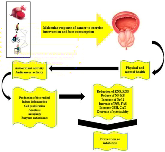 The prostate gland is one of the most influential and pivotal organs in male reproduction under the bladder. The main function of the prostate is to create the right environment for sperm to survive during ovulation [1,2]. Cancer is more common in cells inside the prostate gland and usually occurs in older adults. The adult human prostate is divided into central, lateral, and peripheral regions, as well as fibromuscular regions and cavities [1]. Laboratory evidence suggests that stromal fibroblasts have primary carcinogenic capacity after stimulation with cancer cells, and are believed to play a role in stabilization. Epithelial cells due to high levels of androgen receptors cause hormonal dependence in prostate cancer (PCa) [1]. In addition, the secretion of prostate-specific sorantigen by these receptors increases the risk of PCa. PCa affects millions of men each year. In developed countries, PCa depends on various risk factors including age, ethnicity, genetic background, and stage of progression [3]. Histological features can show the path of disease and cancer during advanced stages. In addition to genetic factors and family history, environmental factors are also influential. Environmental factors affecting the incidence of PCa can include an active lifestyle and proper diet. The following reasons clearly state the reason for conducting the research. These cases can reveal the study of these pathways of scientific signaling with sports and nutritional interventions for effectiveness in an overview. Due to the anatomical features of the prostate gland, most human studies have focused on their quality of life and less on the effects of exercise or dietary supplements on signals, and regarding molecular pathways, most studies have been performed on animal models [4]. A few studies have reported that an active lifestyle combined with proper nutrition can prevent, reduce, and even inhibit the progression of cancer. In the study of Saedmocheshi et al. [5] it was observed that eight weeks of aerobic exercise combined with green tea extract reduced the level of inflammatory factors in mice with PCa. Moreover, Vahabzadeh et al. [6] examined the effect of eight weeks of aerobic exercise with green tea extract on the oxidant/antioxidant balance and found that reducing the level of free radicals improved this ratio and ultimately reduced the progression of PCa. Herbert et al. [7] examined the effects of diet, physical activity, and stress reduction in patients with PCa. They found that an active lifestyle, fruit consumption, and a reduction of fatty diet control cancer. In a few studies, two or three factors affecting PCa have been studied. Due to the presence of effective compounds in red beets such as betanin and betalin, phenolics have antioxidant, anti-proliferative, and strong anti-tumor activities, while also inhibiting the growth and spread of cancer, while exercise also has the mentioned characteristics. Therefore, the article examines the interactive effect of two interventions in the prevention and treatment of cancer. Thus, there is still ambiguity in our knowledge of the effect of natural interventions on signaling pathways and proteins involved in PCs. Therefore, this review will examine the risk factors, the relationship between lifestyle and PCa, and the potential benefit of beetroot on cancer prevention. This article will first focus on the introduction of PCa and then, in order, we will discuss PCa treatment strategies, exercise, beetroot, and the simultaneous use of two interventions due to their anti-inflammatory, antioxidant, and anti-cancer properties in the treatment of PCa.