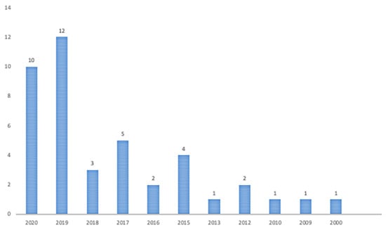 Figure 2 shows that out of the 42 studies, 76 percent were published between 2016 and 2020. In the period 2000–2015, the interest in the topic was not significant (only 10 papers were published). These data show that the topic Sustainability in SMEs has assumed more importance and relevance in WoS-indexed journals in the last 5 years. During the period 2000–2020, the topic attracted increasing scholarly interest among researchers, as can be observed in Figure 2 presenting the distribution of 42 sustainability articles across time.