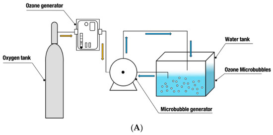 Ozone was generated on site by an oxygen tank and plasma-ozone generator, then injected into the motor (Nikuni, KTM20ND07Z, Tokyo, Japan), which mixed the ozone and water to generate ozone microbubbles (Figure 1). The ozone generator was set to produce ozone concentration at 20 ppm and saturation of ozone (>10 ppm) in OMB water was achieved in 7–9 min. Therefore, 10 and 20 min of activation was chosen. The OMB water flew through a tank which separated the microbubbles and large bubbles. The microbubble delivering tube was placed into the bottom of a plastic beaker containing 10 L of water, and OMB water was circulated back the motor. Based on the preliminary study, the air flow rate of injecting air was 2.5 L/min. The pressures of releasing and retaking water were 4.5 and 2.719 kg/cm2, respectively. The diameter of the microbubbles was determined by a light microscope (Leica, DM500, Wetzlar, Germany) connected to a high-resolution camera (Leica, ICC50 HD, Wetzlar, Germany) and computer with the relevant software (Leica Application Suite V3.4.0). The diameter of the microbubbles ranged from 3.84–11.99 μm, which fitted the definition of microbubbles.