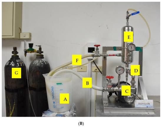 (A) The diagram of the ozone microbubble device. (B) The microbubble system: A: the plastic beaker containing 10 L water; B: water circulating into motor, pressure: 2.719 kg/cm2; C: motor; D: air input, flow rate: 2.5 L/min; E: bubble mixing tank; F: microbubble water entering beaker, pressure: 4.5 kg/cm2; G: oxygen tank. The flow direction of microbubble water is indicated by the arrows.
