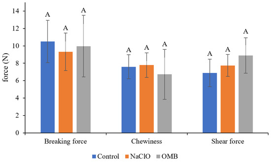 The breaking force (N), chewiness (N), and shear force (N) of tomatoes after various treatments. There were three groups of tested tomatoes: Control: washed by water; NaClO: washed by 100 ppm NaClO, then rinsed by water; OMB: washed by ozone microbubble water for 10 min activation and 30 s washing time. Each group contained 3 sampling spots from 3 tomatoes (N = 9). The same letter on the top of column indicates no significant difference (p > 0.05).