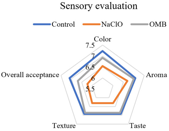Sensory evaluation of the tomato samples on treatment day. There were three groups of tested tomatoes: Control: washed by water; NaClO: washed by 100 ppm NaClO, then rinsed by water; OMB: washed by ozone microbubble water for 10 min activation and 30 s washing time. Each group contained 3 sampling spots from 3 tomatoes (N = 9).