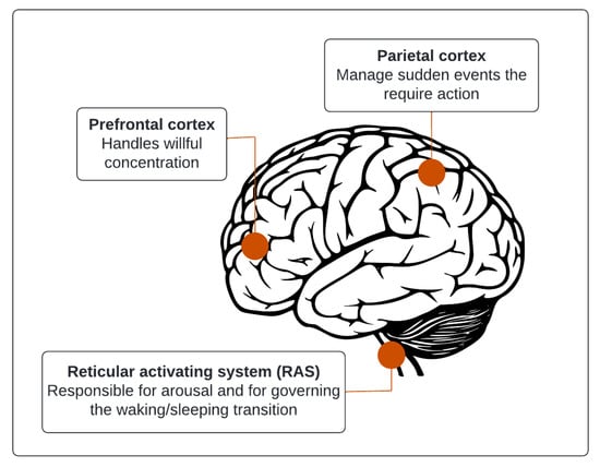 Attention lies in two areas of the brain, as shown in Figure 1. The first area is the prefrontal cortex, located behind the forehead and spanning to the left and right sides of the brain, which handles willful concentration. As part of the motivational system, it helps a person focus attention on a goal. The second area is the parietal cortex, behind the ear, for sudden events that require action.
