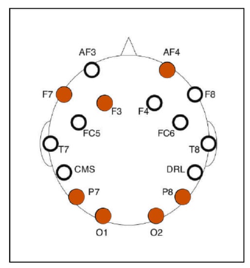 We first averaged the EEG signals and then resampled the frequency to 128 Hz per channel. Based on prior knowledge of EEG, the correlated signal frequency ranges produced by the brain during attention states are mainly concentrated below 40 Hz. Therefore, the useful frequency band in EEG signal data is between 2 and 40 Hz. Because of this, we used a band-pass filter ranging from 2 to 40 Hz. Subsequently, we used ICA filters to eliminate artifacts. A selection of electrodes was based on attention mapping with brain areas (prefrontal cortex and parietal cortex). Figure 2 shows the selected electrodes in our study, i.e., F7, F3, P7, O1, O2, P8, and AF4.