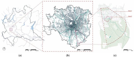 Study area location: (a) the study area is located in the region of Lombardy, in Italy; (b) the study area is located within the municipality of Milan; (c) a specific focus area (area 2), was identified as the most strategic location to investigate a site-specific approach within the studied area (area 1).