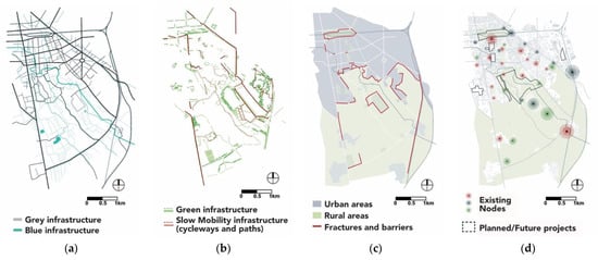 Spatial mapping of the problems and potentialities of the study area: (a) Continuous infrastructures (grey and blue infrastructures); (b) Fragmented infrastructures (Green Infrastructure and Slow Mobility network of cycleways and pathways); (c) Fractures and barriers between urban and rural areas; (d) Existing nodes/centers and planned/future projects foreseen for the area.