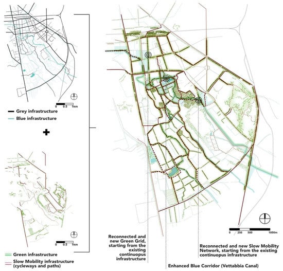 The map (on the right-hand side) represents the overall strategy proposed to repair the fragmented infrastructures. Starting from the traces of the existing continuous infrastructures (Grey and Blue Infrastructures), the existing fragmented infrastructures (such as the Green Infrastructure [GI] and the Slow Mobility Network) can be reconnected and completed through new portions of cycleways and pathways, as well as new GI elements.