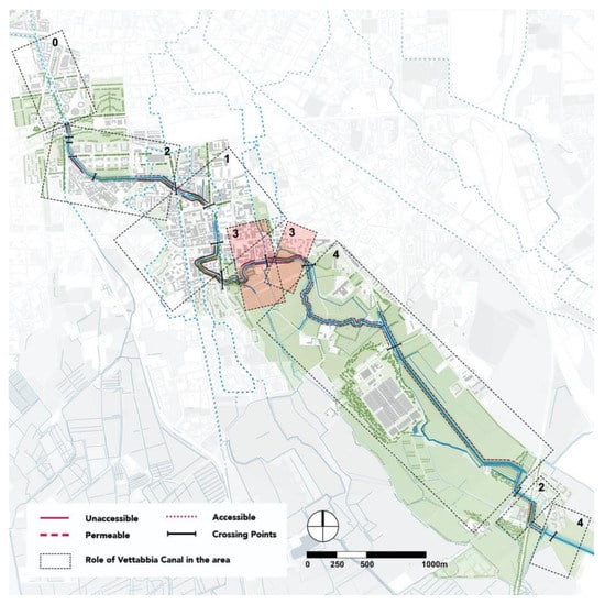 Map describing the relation of the Vettabbia Canal with the surrounding urban and rural context. In particular, the following typologies are identified: 0. (Not visible); 1. Urban–Urban (Passive back side), 2. Urban–Public mixed use (Landscape edge); 3. Urban–Rural (Landscape barrier); 4. Rural–Rural (Landscape backbone).