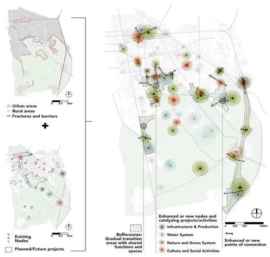 The map (on the right-hand side) represents the overall strategy proposed to approach the urban-rural transition: the existing network of nodes can be enhanced with the creation of new nodes/centers, while the fractures and barriers between urban and rural spaces can be addressed through a series of strategic transition zones.