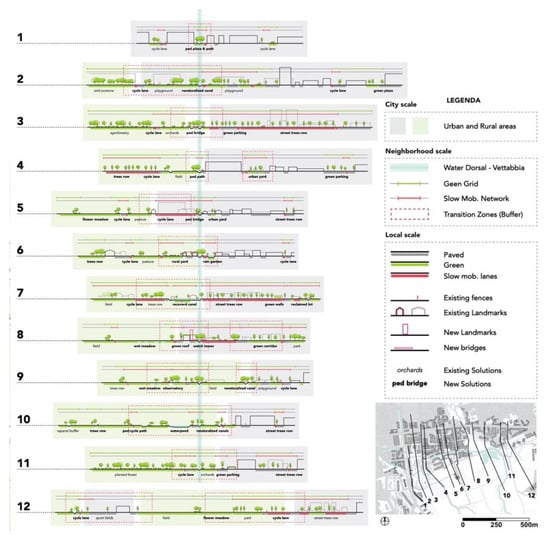 A series of sections (Figure 8) helps to understand the relation between urban and rural spaces. It shows how even small design interventions can completely modify the balance of the public space and give new importance to previously marginal or unused areas which are characterized by poor environmental quality and low accessibility.