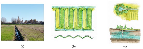 - Landscape and waterscape features, which are inspired by the function of traditional heritage elements such as the marcita and fontanile, which used to be among the traditional features of the local rural landscape, are taken into account in enhancing the local ecosystem. Such landscape features were characteristic heritage elements of the site and, unfortunately, have disappeared along with the rich network of ES they procured [30,53]. Marcita and fontanile can boost biodiversity as they entail functions which are nowadays attributed to NBS such as: plant-based water treatment, wetland ecosystem development, and pasture growth throughout most of the year. The introduction of a new water pond which is linked to a designed marcita-type field and fontanile-type pond, creates a blue infrastructure network which cleanses water and can assemble and provide shelter to species of fauna and flora which used to be flourishing in the marcita and fontanile micro-environment. The introduced blue-infrastructure network is addressed to the community, as a means of environmental educational infrastructure, while it can also be supportive of the development of UPUA in the urban fringe area. Moreover, by monitoring the marcita-type field, where the Vettabbia water is cleansed before entering the pond-reservoir [and providing water for UPUA], the observation of the water quality of the Vettabbia water can be controlled.