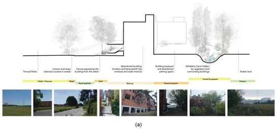 In contrast to this general condition of abandonment, both in the urban and the rural sides of the studied area, several projects are currently implementing new innovative regeneration actions and participatory activities [36,42,48,50]. They involve the local multicultural community and show the local interest and commitment against the neglect of the research site’s open spaces.