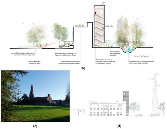 On the other side, the rural portion (which was formerly managed by religious orders and gradually conquered by the urban sprawl phenomenon) has lost its character of landscape structure and regulation. However, the institution of the rural protected green belt of Parco Agricolo Sud Milano in recent decades has prevented further urban expansion and has brought new attention to the importance of this green area for the local community. It encourages groups of citizens and local associations to take care of the site and it starts regeneration projects [30,35,36]; it encourages agro-ecological practices, such as agro-forestry and urban agriculture, with the aim of reversing the loss of biodiversity and engaging the local community [16,17,37].